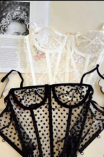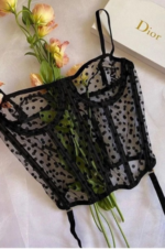 • Zarif dantel/mesh/file detaylarıyla süslenmiş, şıklığı ve rahatlığı bir arada sunan siyah balenli puantiyeli vintage korse.